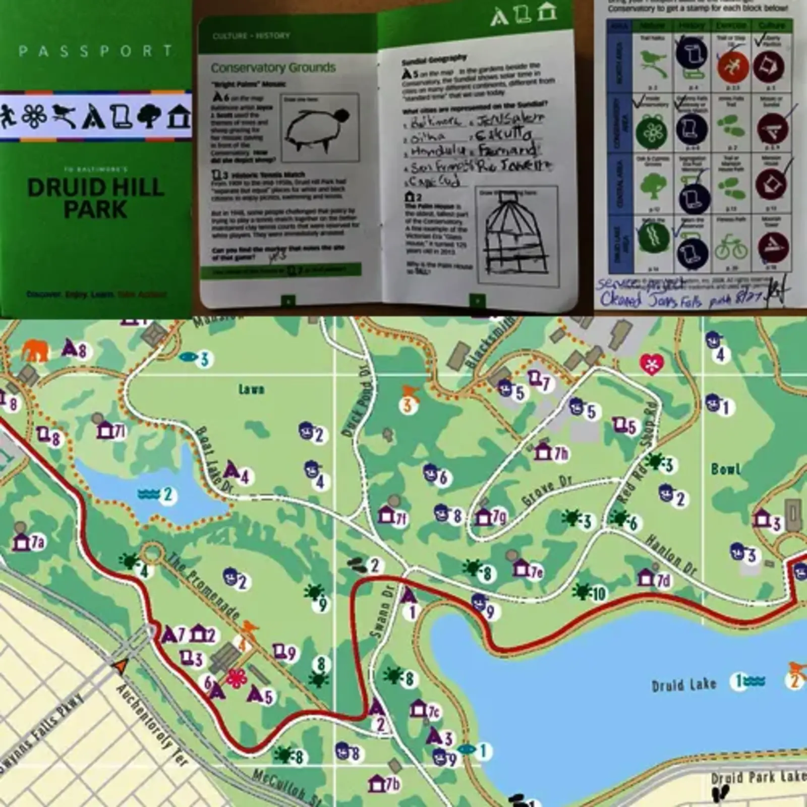 Created by the Baltimore Green Map project, which also made terrific Green Maps featuring this park, the watershed and the city. This is a continuous resource, the map updated periodically and new experiments with digital scavenger hunts. The passport shows the diversity of resources in all parts of the park, from disc golf course, to zoo, to Conservatory, to walking/running trails and much more. The Passport activities are categorized under Nature, History, Culture and Exercise. It has been used by schools, summer programs, and for individuals and family explorations. The Conservatory has colorful icon stamps for rewards.