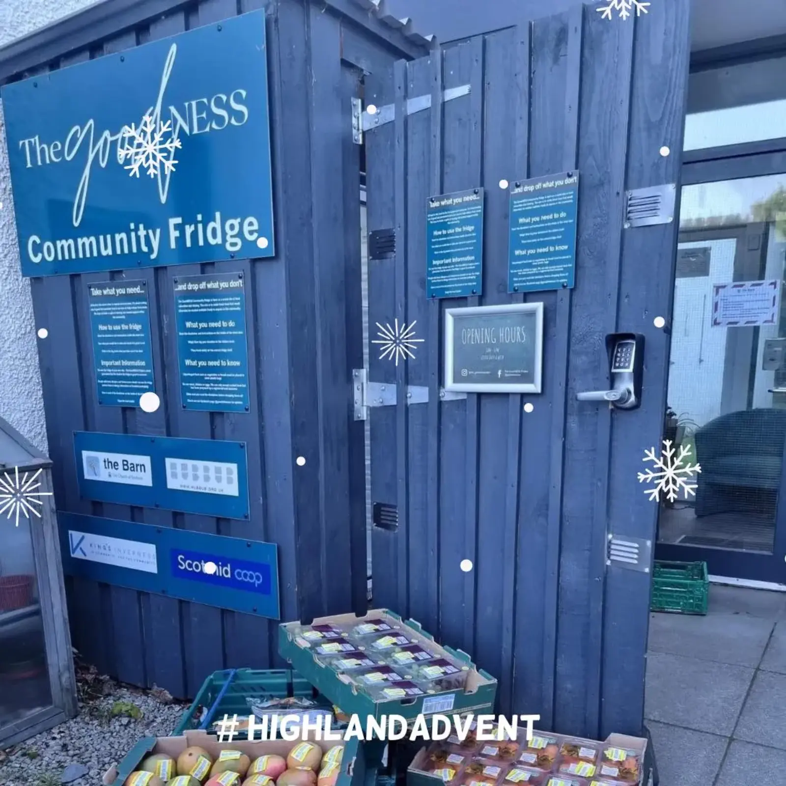 The Community Bothy aims to reduce waste by distributing a surplus of frozen and packaged foods. The community bothy is open to anyone who can make use of it; opening times can be found on the website linked below.