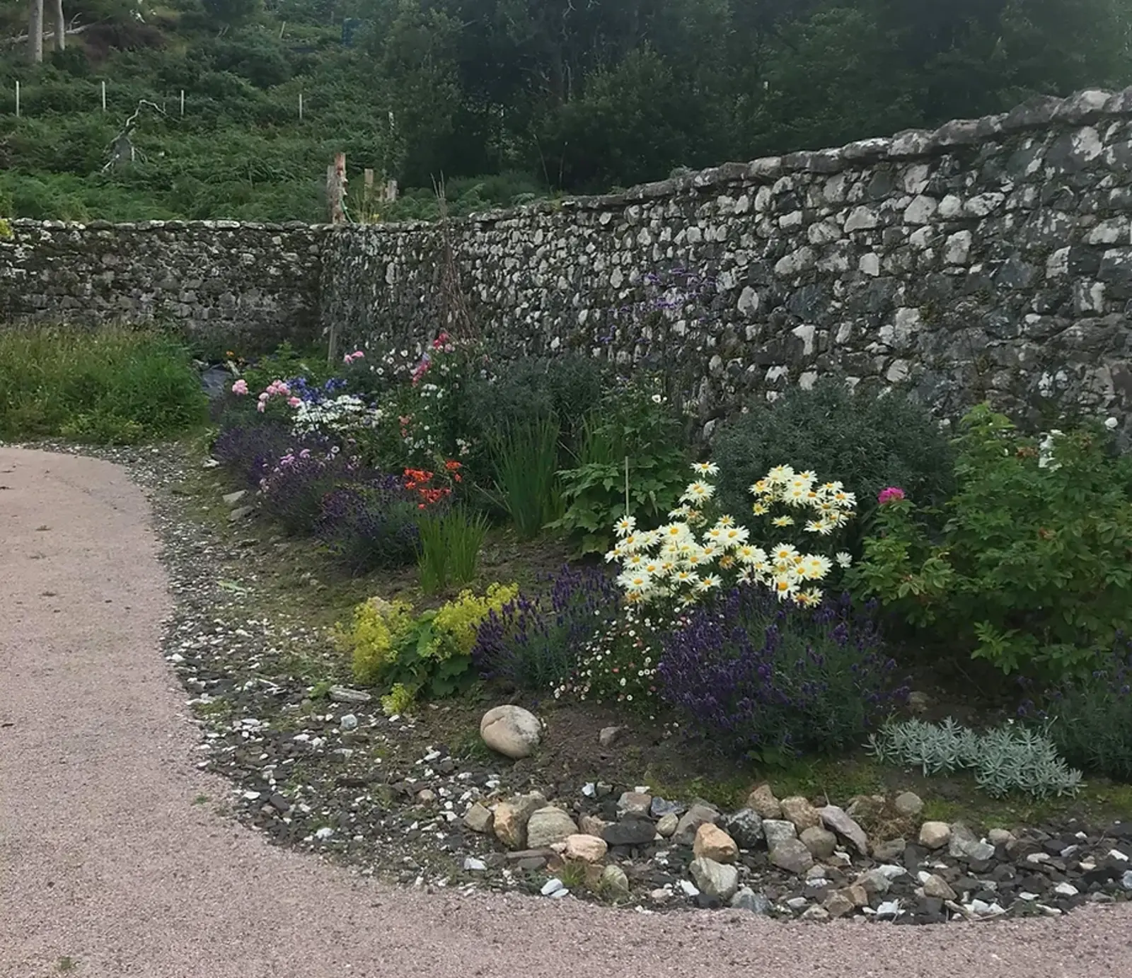 The Walled Garden was built at the same time using lime mortar and the local Lewisian Gneiss, giving it its grey and blue colour. It holds fruit bushes and trees.