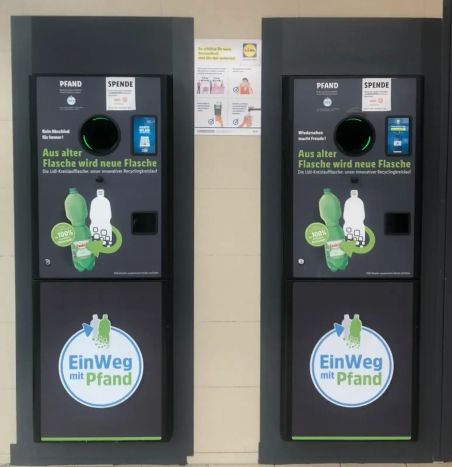 In Lidl supermarket, you will find exchange bottle machines. For each bottle you put in, you get 0.25€ back 💰. Don’t forget to check the label to see if it is recyclable ♻️. When you have no bottles left just press the small button and you get a voucher with the value of your bottles. After you finished shopping you can hand the voucher to the cashier to get your discount.