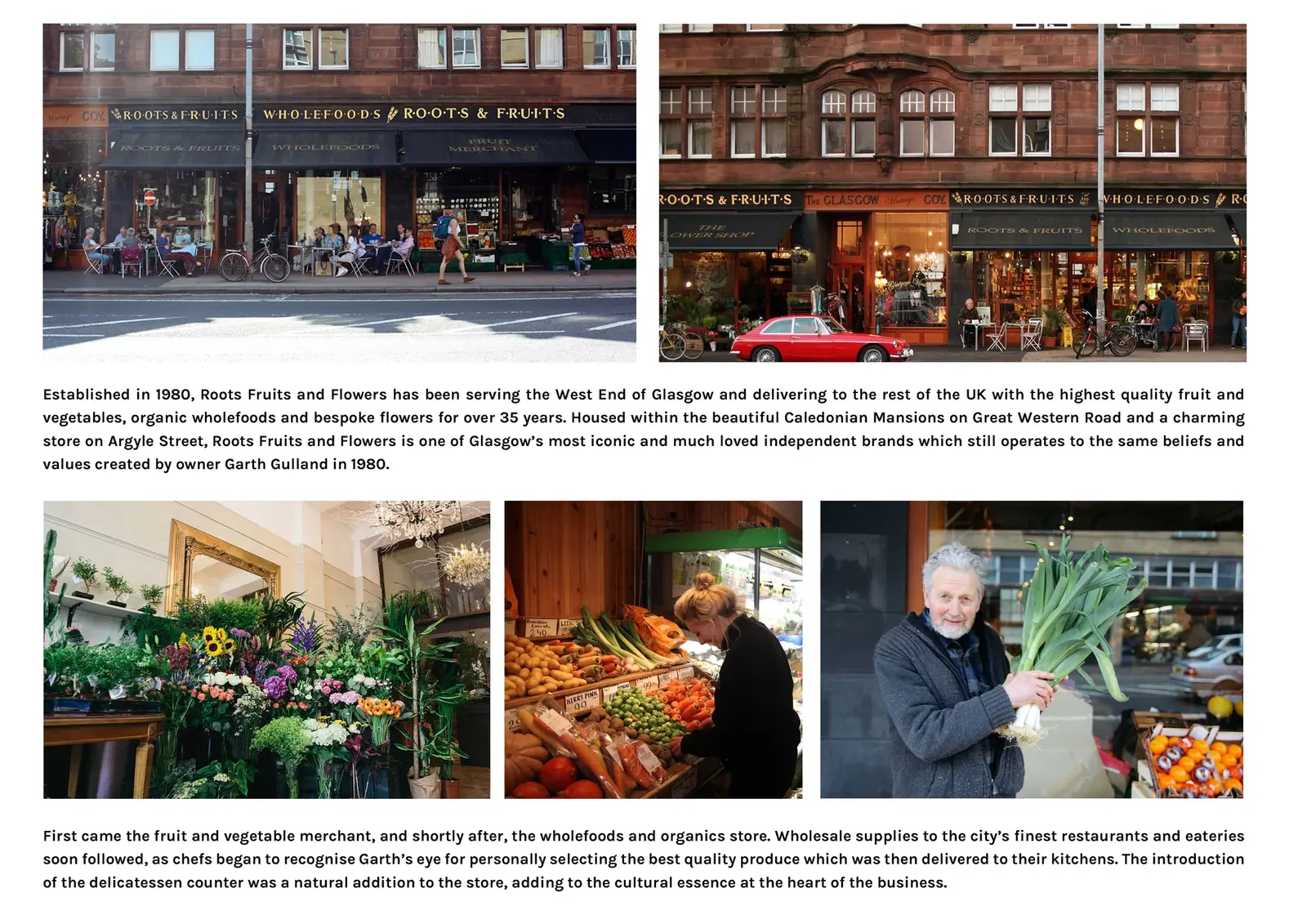 Roots, Fruits, & Flowers (used interchangeably with 'Roots & Fruits') is a local, long-established supermarket / deli / florist / café in Glasgow's West End. Since 1980, RFF has been serving Glasgow & delivering throughout the rest of the UK, providing high quality fruit & vegetables, organic wholefoods, & bespoke flowers.