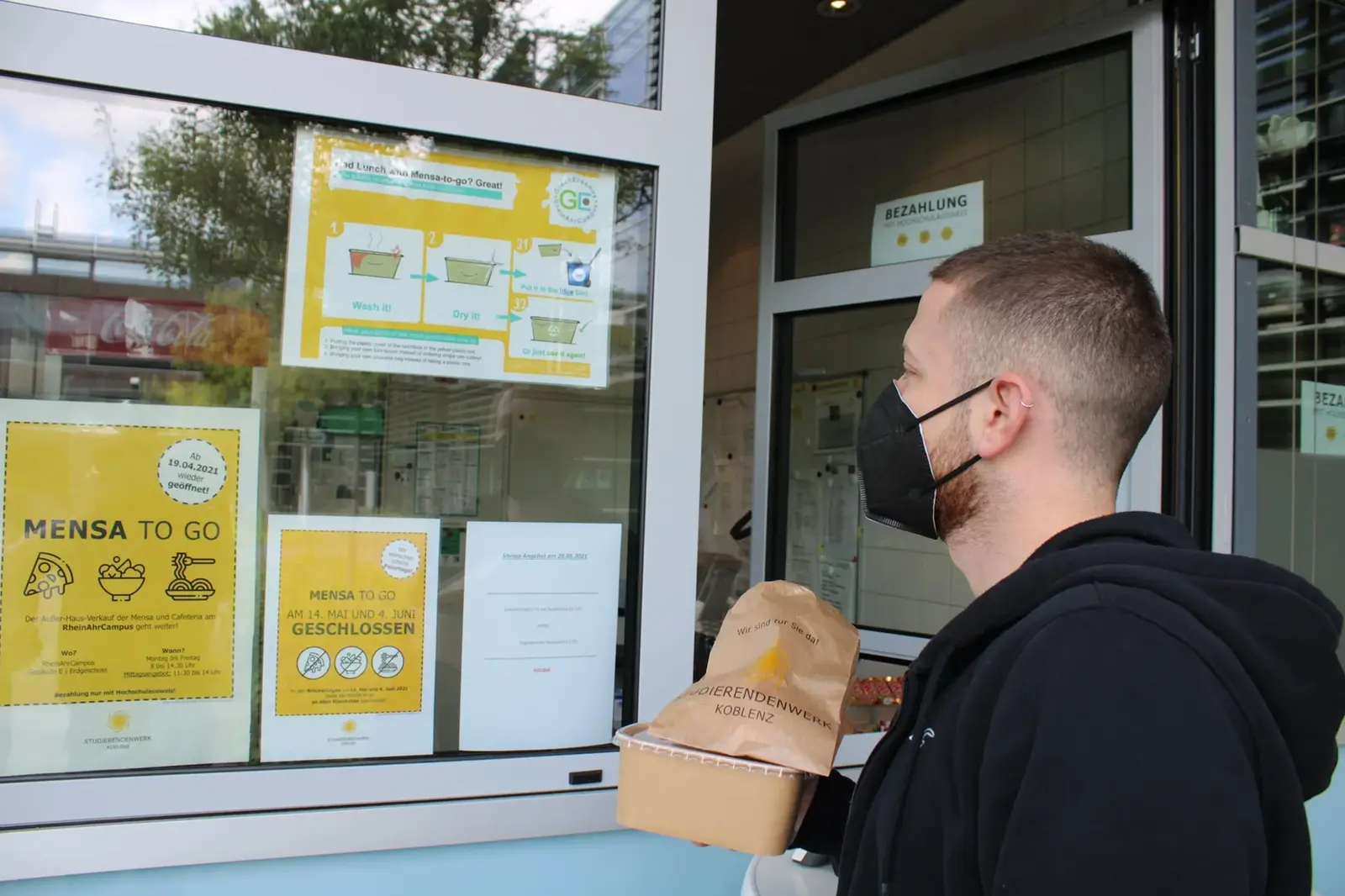 Due to the pandemic , the cafeteria on the RheinAhrCampus will have a limited take-away offer from April 19, 2021 ( cafeteria to go ).