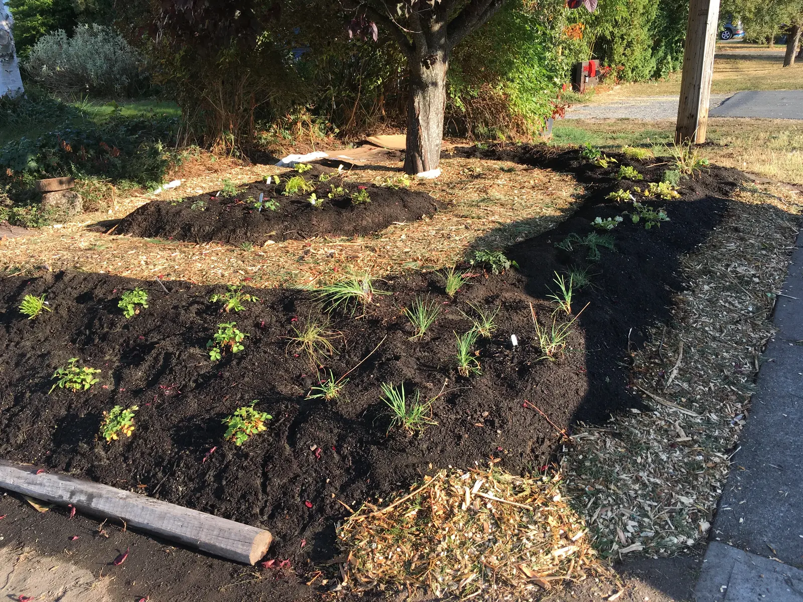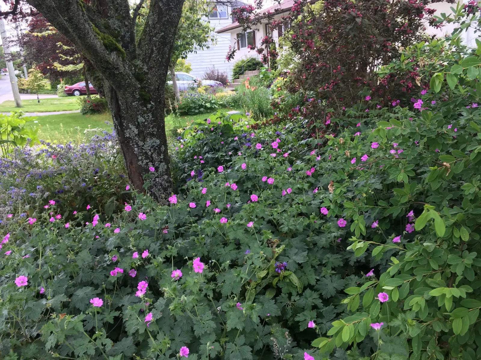 Lots of plants for pollinators throughout the yard to build habitat and biodiveresity. Leave things as much as possible in the Fall and over the Winter so birds can feed and the insects that laid their eggs on plant matter or in the soil can rest undisturbed and emerge in the Spring. Yarrow, lavendar, ocean spray, rosemary, coast penstemon, cape fushia, brassicas left to flower. Lots of native bees, hummingbirds, and other insects. Looking forward to learning more about who they are and their needs! * Updated in Fall 2022 front planted as a shady native plant garden - sticky cinquefoil, small flowered alumroot, wild strawberry, lady fern, pacific bleeding-heart, red columbine, yarrow, fringe cup, and sea blush.