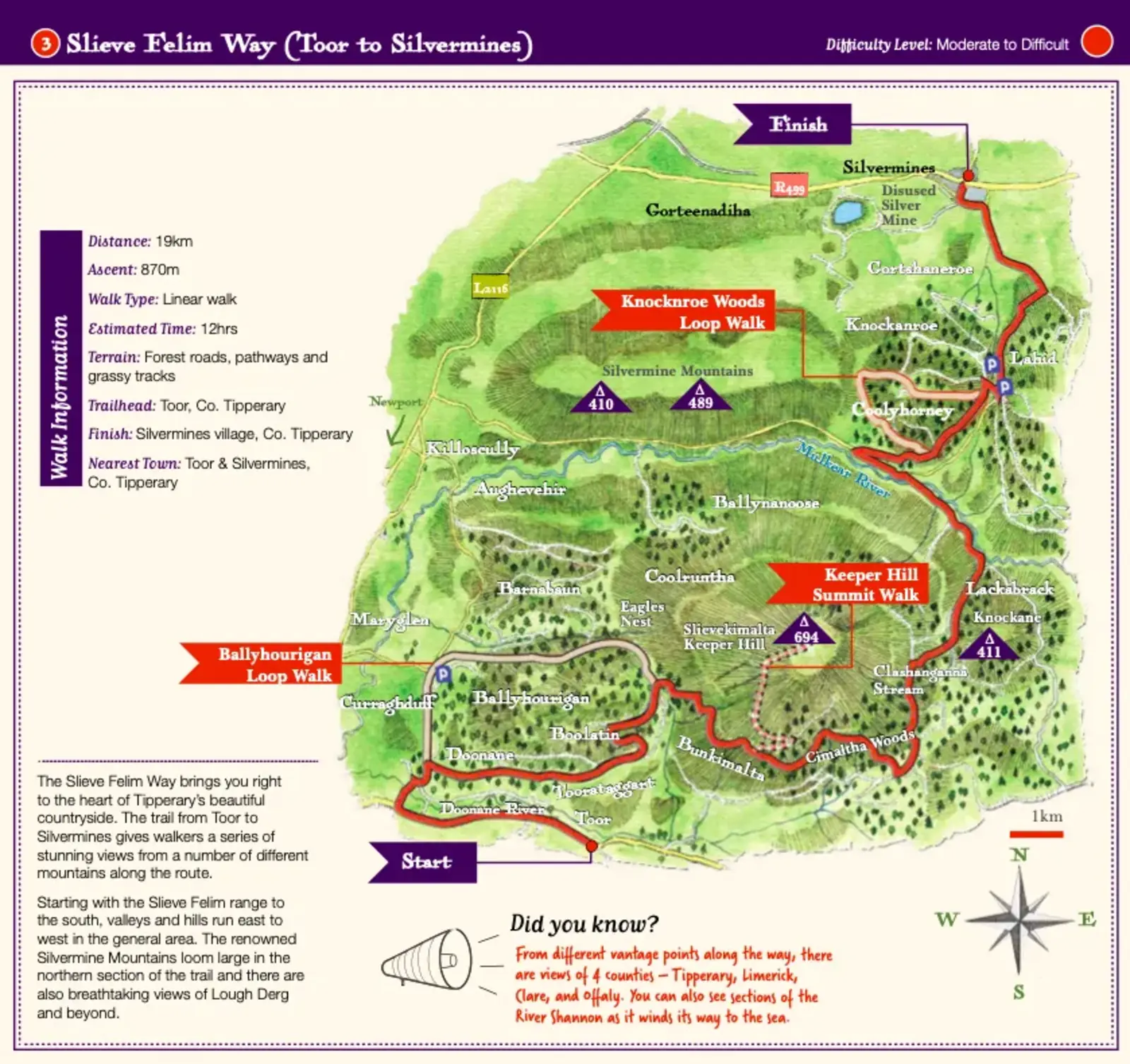 The Slieve Felim Way is a 43km linear walking route through the counties of Limerick and Tipperary well away from the hustle and bustle of main roads. The route weaves its way from the village of Murroe through foothills and around Slieve Felim (422m), Keeper Hill (694m) and the Silvermine Mountains (475m) to finish at the former mining village of Silvermines. Near the southern end of the route and worth a visit is the Benedictine monastery of Glenstall Abbey. The terrain consists of quiet roads, forestry tracks and field paths: some wet stretches may be expected. The total aggregate ascent over the route is less than 900m, and there are no significant climbs, but there are some spectacular long views from the route, particularly along the northern section.