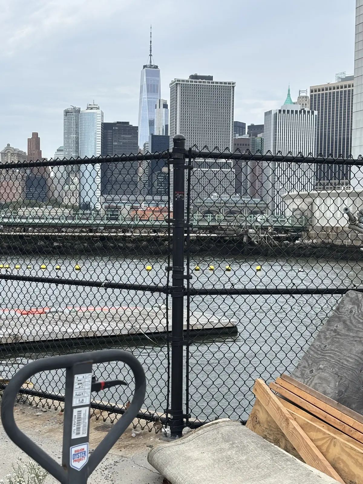 The oyster reefs in the water at this location are in man-made cages, created and managed by the Billion Oyster Project. Oysters are filter feeders, meaning they filter through the water to remove algae, to eat, and often filter out pollutants as well. The oyster reefs also provide habitat for hundreds of species and can help protect New York City from storm damage.